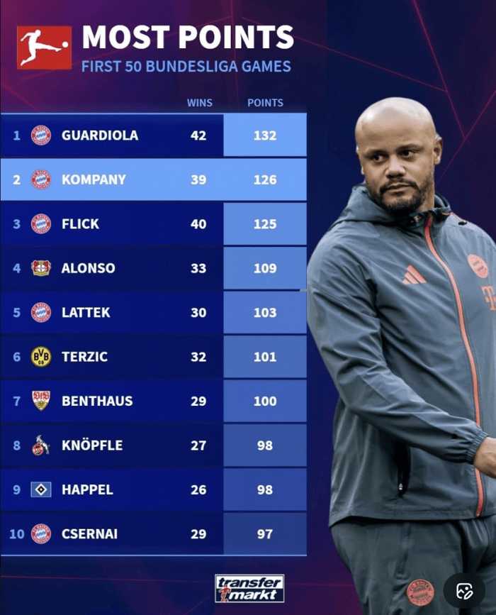 虎扑01月14日讯 根据德国转会市场的统计,孔帕尼是德甲联赛历史上执教前50场获得积分第二多的教练,仅次于瓜迪奥拉